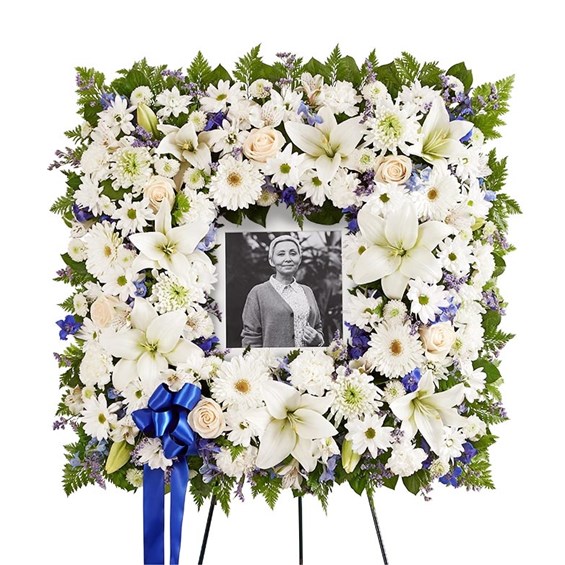 Offer solace with a sentimental arrangement for the services. Our square wreath features soothing-hued blooms and greenery for a lush, full presentation. A photo can be displayed in the center, creating a unique and beautiful tribute to a cherished loved one.